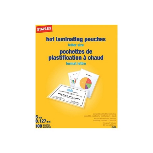 Protect your documents with this pack of 100 staples laminating pouches.